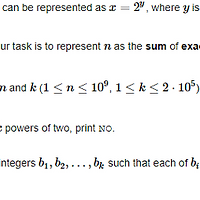 C번) 문제 링크 : http://codeforces.com/contest/1095/problem/C 문제의 입력으로는 n과 k가 주어진다. 쉽게 설명해서 주어진 숫자 n을 k개의 2의 거듭제곱의 합으로 나누는 것이다. 사용한 방법은 우선 k와 상관없이 필요한 최소한의 개수를 구하는 것이다. ex) n=9, k=4라고 하자. 이 때, 필요한 최소한의 개수는 1과 8 즉, 2개이다. 최소한의 개수가 구해졌다는 것은 2의 거듭제곱 형태로 나타낼 수 있다는 것이다. 이 형태는 2진수의 형태에서 1인 값들과 동일하다. 여기까지만 생각하고 바로 YES를 출력해서는 안된다. 문제에서 요구하는 YES/NO의 조건은 2의 거듭제곱의 합 형태로 나타낼 수 있느냐가 아닌 k개의 2의 거듭제곱의 합으로 나타낼 수 있느냐이다..